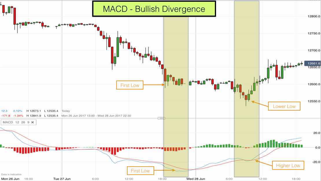 When price makes a new low in a downtrend but the MACD histogram shows only a very small series of red bars (red candlesticks) then this can indicate a bullish divergence. Price may be about to rise and swing higher.